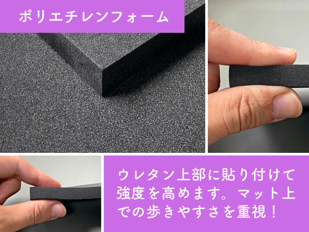 ウレタンフォームと組み合わせて貼り合わせることで、ウレタンだけのマットよりも底付き感が少なく、衝撃が和らいで安心感が高まります。